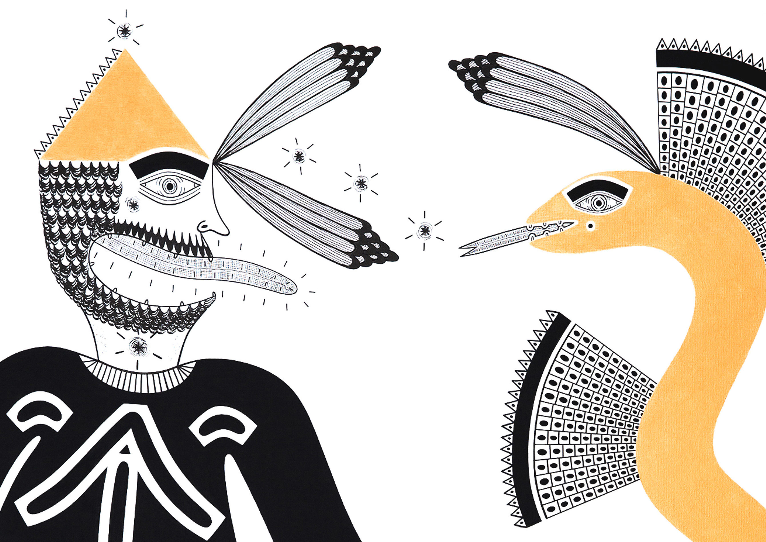 This latest series of paintings on canvas features my signature long-limbed bearded characters. This is the first time I’ve worked on canvas and at this scale it feels like a fresh chapter with quite literally more room to paint than ever before. I’ve limited the colour palette to gold, black and white playing with a 'Yin and Yang' balance where the gold and black creates a sharp contrast between the light and the dark. These scenes, are inspired by ancient hieroglyphic artworks and symbols. I have depicted my own versions of these ancient rituals, comprised of symmetrical coincidences and elongated angles.