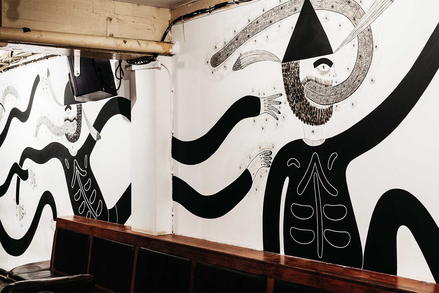 6ft x 20ft long mural for the month-long take over exhibition 'Bro-Down' in the basement of the Notting Hill Arts Club, featuring my bros getting down on it. All hand-painted using acrylic paint.