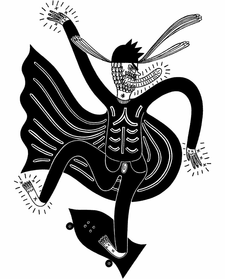 In conjunction with my 'Sidewalk Flyer' complete skateboard for Shakastics, a limited run of hand screen-printed 'High Flyer' t-shirts. Double caped bro back print and breast character bro. Take-off was somewhat guaranteed with this t-shirt!